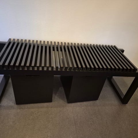Har en enkelt ridse i malingen øverst. Se foto. Kan dækkes med en sort tusch. Se også min annonce for en Gallery skammel, der fint matcher knagerækken.
