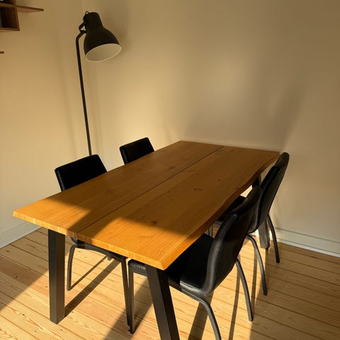 Smukt køkkenbord fra Ikea. Velbevaret med kun mindre brugsspor. Der medføres to sorte metal stole med, de er dog ikke fra ikea.