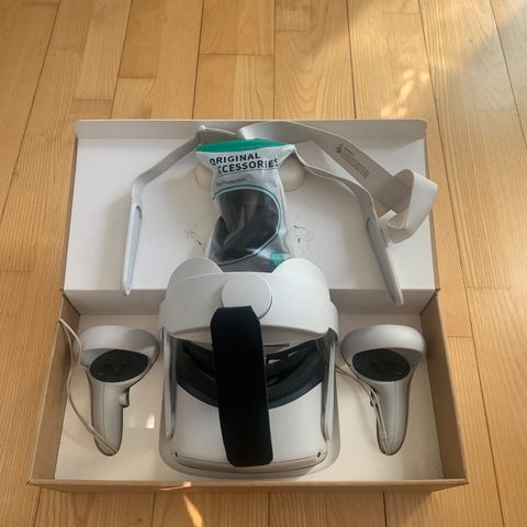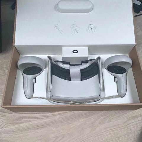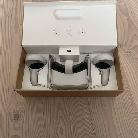 Meta Quest 2 VR-headset i hvid. Sættet består af VR-brille og to trådløse controllere med håndstropper. Headsettet har justerbar rem og polstret ansigtsmaske. Velegnet til virtual reality-spil og -oplevelser, trådløs brug og interaktive applikationer. Kan anvendes både stående og siddende afhængigt af indhold og pladsforhold.