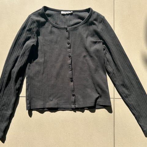 Gina Tricot bluse til pige i str. 146. Blusen er sort og fremstillet i bomuld. Den har lange ærmer, v-udskæring og let rynkedetalje foran. Stoffet er ribbet, og kanten forneden har bølget afslutning. Velegnet som hverdagsbluse eller til brug over en top.