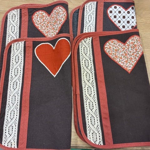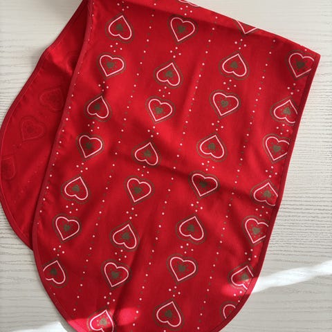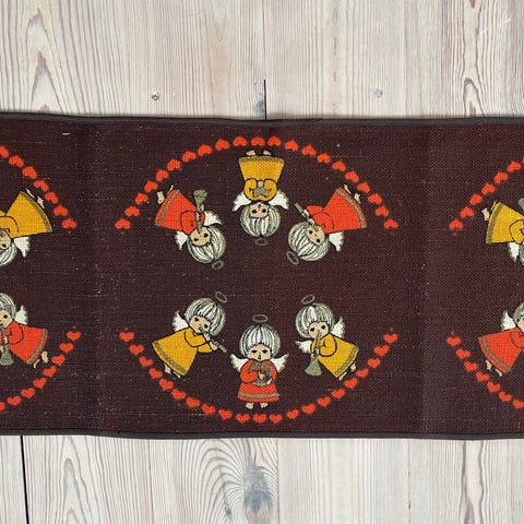 Retro bordløber dug brun, rust, creme m hjerter håndarbejde 70’erne