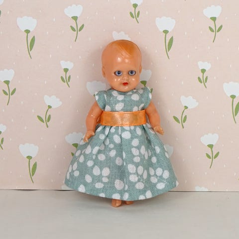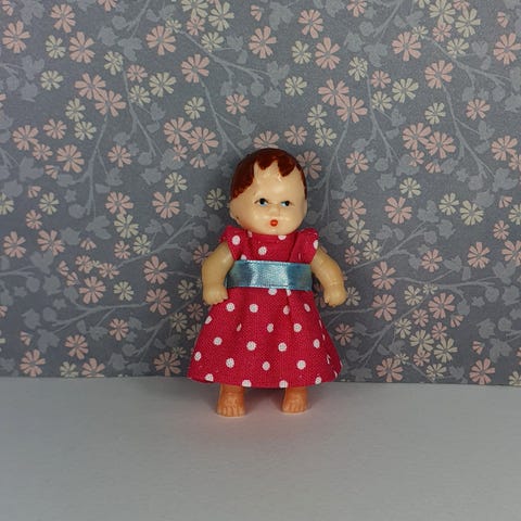 Jeg har håndsyet en ny kjole til hende af prikket bomuld med et bælte i satinbånd og underbukser i bomuldsjersey. Der er en lille smule limrester foran på kjolen, lige under bæltet. Tøj er ikke aftageligt, det er syet og limet på.