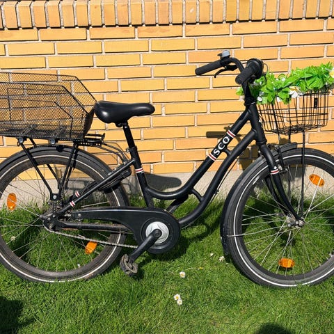 Sco børnecykel med 24" hjul. Cyklen er sort i farve og er udstyret med skærme, cykellås og støtteben. Stel og komponenter er velegnede til børn, der har brug for en cykel i 24" størrelsen, fx til skolekørsel og fritidscykling på både asfalt og lettere grusveje.