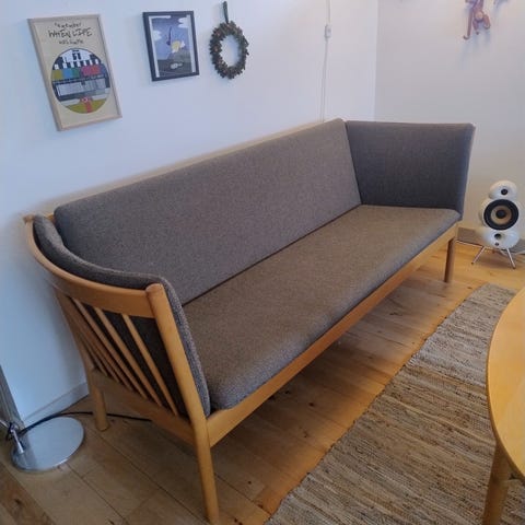 Flot og velholdt Erik Ole Jørgensen tremmesofagruppe i bøgetræ med patina. 3 + 2 personer i kokssort uld. (J148 - J149)