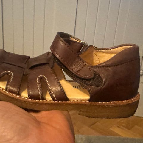 Sandalerne er i brune nuancer med kontrastsyninger og mønstret gummisål for bedre fodfæste.