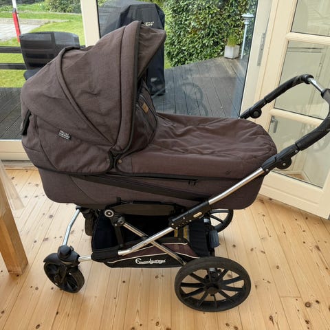 Odder barnevogn i klassisk model med stor liggedel. Vognen har kraftigt stel med fire store lufthjul og justerbart styr.