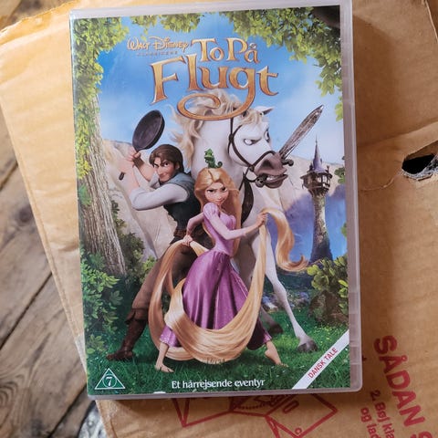 En DVD med filmen 'Tangled' fra Disney. Forsiden viser karakterer fra filmen, Rapunzel, Flynn Rider og en hest. Bagsiden indeholder beskrivelser af filmen og inkluderet bonusmateriale, samt tekstinformation om sprog og formater. Covers oplyser om filmens indhold og rating.