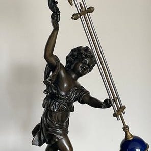 Napoleon III stil bronze- og træ pendul-ur fra 1850–1900 med mekanisk værk, flere dages gangreserve, klokke med slag, fransk oprindelse, i god brugt stand med patina og små slitage mærker, 42 × 22 × 16 cm, 5 kg, med optrædningsnøgle. Klik på den blå "gå til varen" knap, for at købe eller byde på denne vare. Den samlede pris vil blive vist inden du afgiver dit bud.