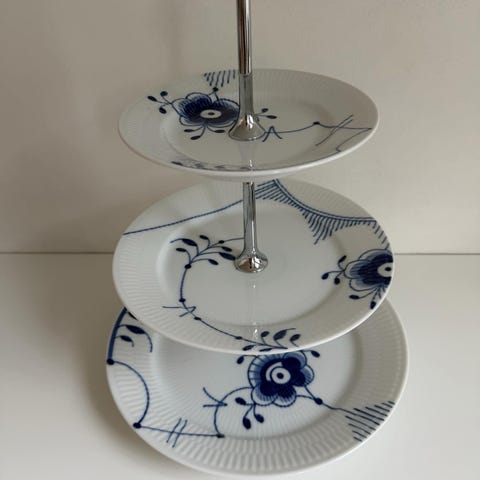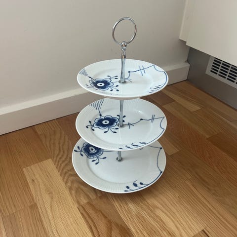 Royal Copenhagen etagere i porcelæn i klassisk blå/hvid dekoration. Består af tre runde tallerkener monteret på metalstang med greb øverst. Velegnet til servering af kager, småkager, snacks eller frugt. Designet passer sammen med øvrigt stel fra Royal Copenhagen i lignende blå/hvide mønstre.
