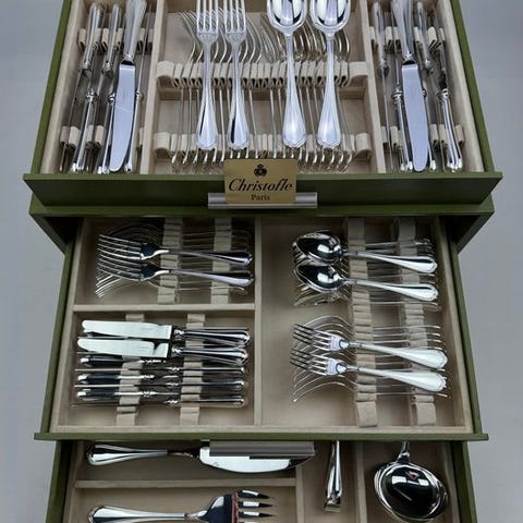 Elegant bestikservice Christofle model Touraine, bestående af 127 dele til 12 personer. Kendetegnet ved harmoniske linjer og en klassisk og målbar elegance, udtrykker Touraine raffinementet i den franske tradition med en sober og tidløs stil.