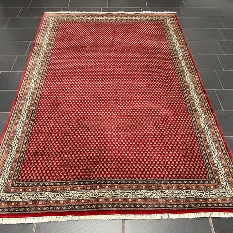 Fondfeltet er holdt i lyse beige- og naturtoner og dækkes helt af små, ensartede Mir-motiver, som giver tæppet et fint og struktureret udseende. Den umløbende bordur i varme røde- og mørkeblå nuancer udgør en markant kontrast og indrammer helheden harmonisk.