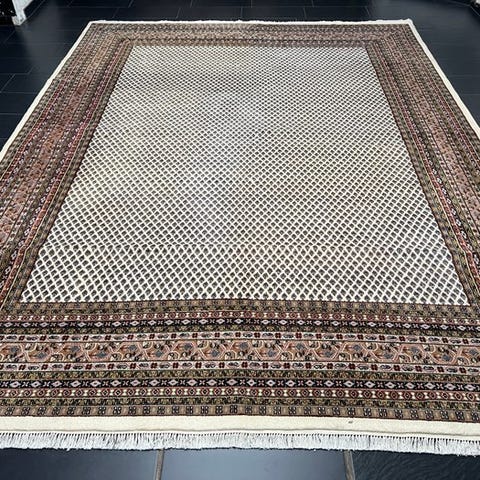 Til salg står et håndknyttet orientalsk tæppe i klassisk Sarough Mir-design, der gennem sit gennemgående, regelmæssigt an-bragte Boteh-mønster skaber en rolig og elegant effekt.