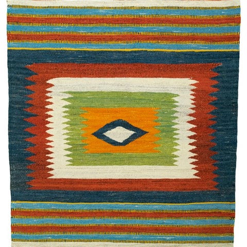 I midten findes et dekorativt rombmønster, som giver kelim’et en afbalanceret og traditionel udstråling. De fine farvede striber i enderne afrunder designet og fremhæver det håndværksmæssige præg af dette kelim.