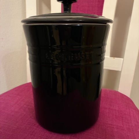 Le Creuset opbevaringskrukke i sort keramik. Firkantet krukke med låg og integreret tætningsring. Indersiden er lys glasur, mens ydersiden er blank sort med dekoreret motiv på siden og Le Creuset-logo på låget og bunden. Velegnet til opbevaring af tørvarer som sukker, kaffe, te eller andre køkkeningredienser. H14cm B8,5cm