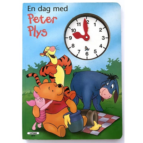 Peter Plys overrasker vennerne, papbog, super fin bog, historie, hvor man lærer klokken at kende.