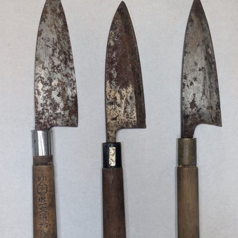 Set af 3 sjældne vintage japanske Deba-knive – Restaurationsprojekt i håndværksmæssig tradition: Yoshitomo, Minamoto Otofus, Tojuro