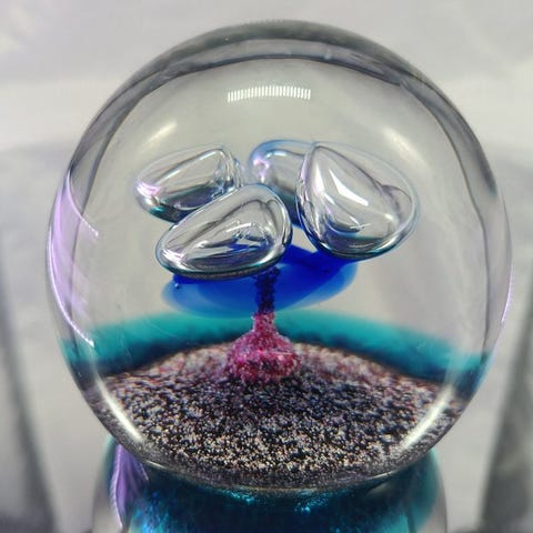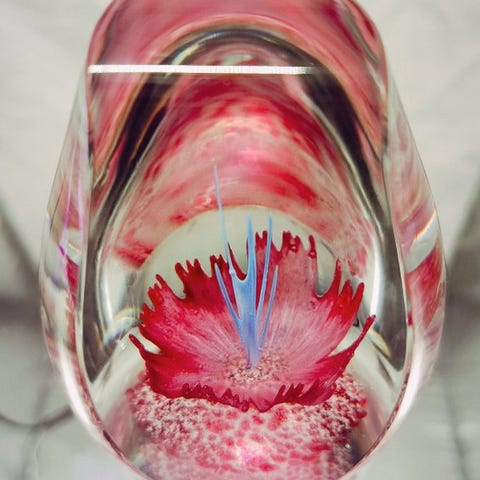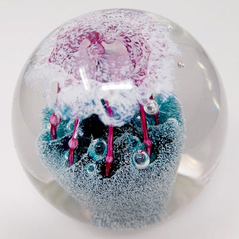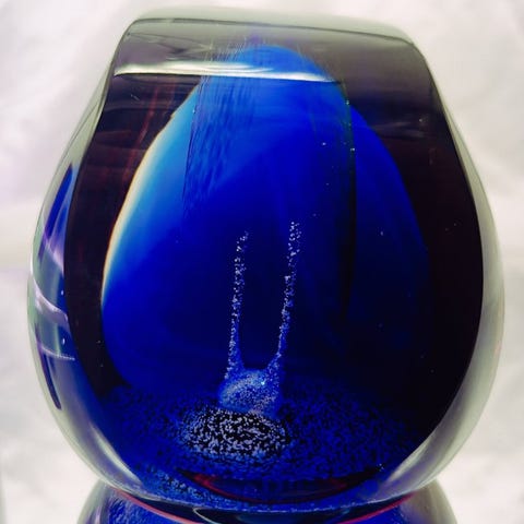 Sjældne og spektakulære farvevariant af papirvægtet "Spindrift", designet af Peter Holmes og håndlavet i 1986 af Selkirk Glass, Skotland. Højkvalitets håndlavet samlerobjekt med signatur.