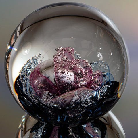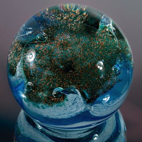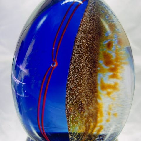 Kugleform. Brevvægt i kugleform viser spiralkraftigt drejede glasbånd i smukke orange- og gule nuancer, der hæver sig over en stor luftpude. Vidunderligt farvespil og smukke optiske effekter - særligt ved passende belysning.