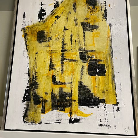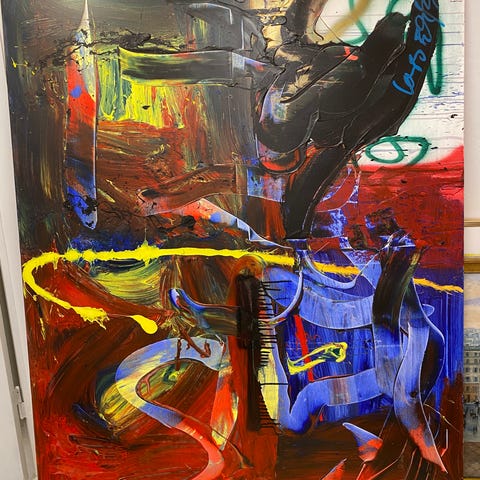 Abstrakt maleri på lærred i røde, sorte, hvide og gule nuancer. Motivet fremstår ekspressivt med organiske former og figurative elementer. Velegnet som vægdekoration i stue, kontor eller andre opholdsrum. Maleriet er udført i en moderne, abstrakt stil med stærke farvekontraster. Signeret A.H. Bali 85 x 65 cm