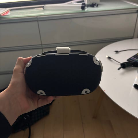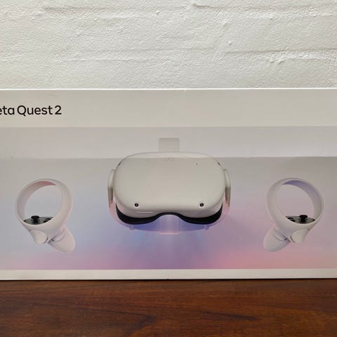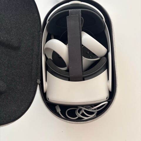 Meta Quest VR-headset i hvid farve. Headsettet har justerbare stropper og polstret ansigtsmaske for komfort ved brug. Sættet inkluderer et VR-headset og en håndkontroller, som bruges til styring i virtuelle miljøer og spil. Velegnet til VR-oplevelser, spil og multimediebrug. Der kommer original oplader og kassen kommer med.