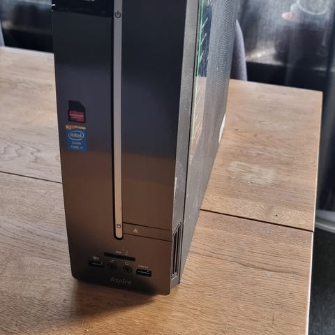 Stationæren er en Acer Aspire GX-781 model. Ifølge mærkaten på kabinettet er den udstyret med en Intel Core i5-processor (7. generation), et NVIDIA GeForce GTX 1060-grafikkort, 256 GB SSD-lager og 8 GB DDR4 RAM. Kabinettet er sort med røde detaljer og har fronttilslutninger samt kortlæser. Den er mærket med understøttelse af trådløst netværk og Bluetooth samt standard kablet netværk (10/100/1000). Velegnet som almindelig hjemme- eller kontor-pc og til opgaver, der kræver dedikeret grafikkort.