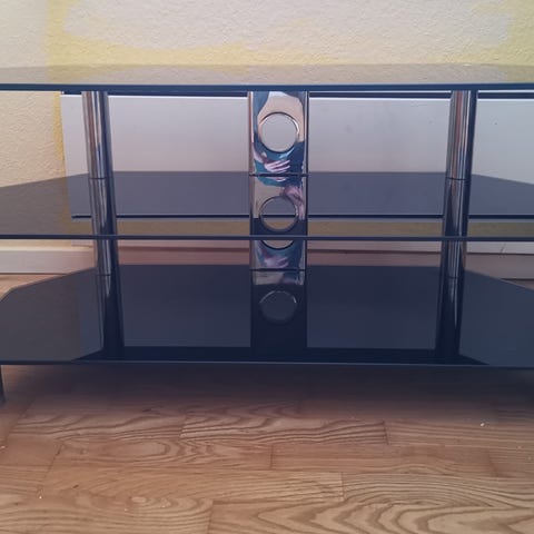 Sælger dette flotte og moderne TV-bord i sort glas og metal – fremstår i pæn stand og passer perfekt ind i en moderne stue.