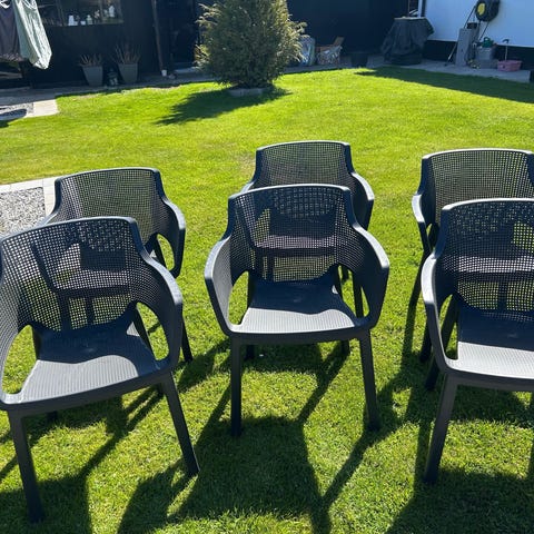 8 Havestole i grå plast - flot kvalitet