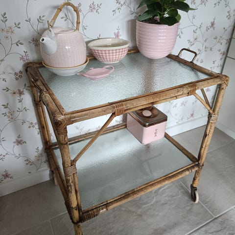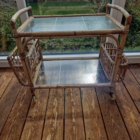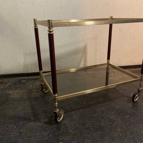 Vintage serveringsvogn med glasplader købt i antikforretning Malmö Retro Lampor i Sverige.