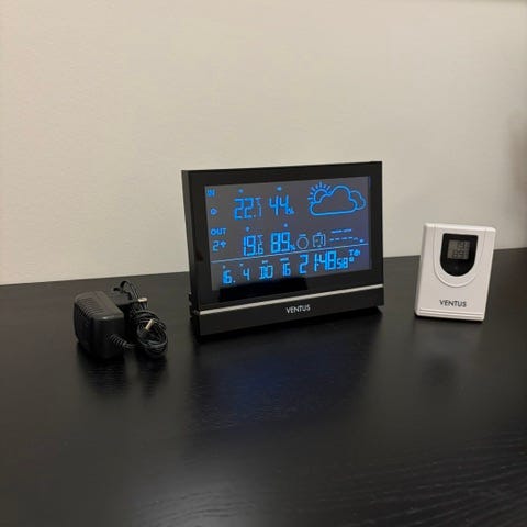 Amelia digital kalenderur i hvid. Uret viser tydeligt klokkeslæt, ugedag, del af dagen og dato på en stor skærm. Enheden står frit på bord eller hylde med integreret fod. Leveres med brugervejledning, som viser opsætning og funktioner. Velegnet som overskueligt tids- og datour til hjem.