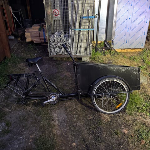 Ladcykel fra Sorte Jernhest (Black Iron Horse), der har set bedre dage, men kan komme til at køre igen med en kærlig hånd. Baghjulet skal skiftes og en generel opdatering er nødvendig - ellers kan den bruges til reservedele. Kalechen er revnet lidt, men vi har brugt den alligevel. Cyklen sælges, da vi vil opgradere til en model med el. Standen er afspejlet i den meget lave pris.