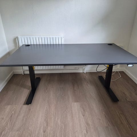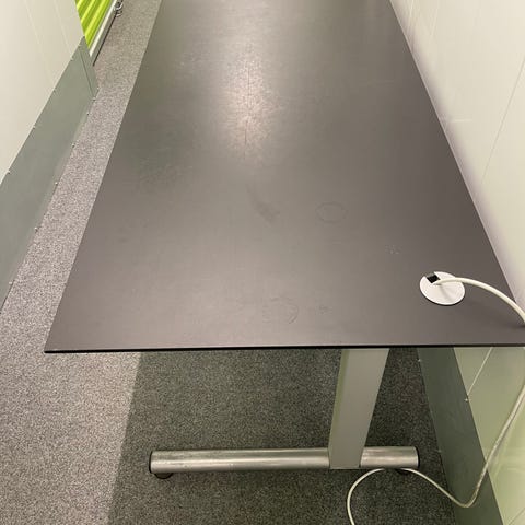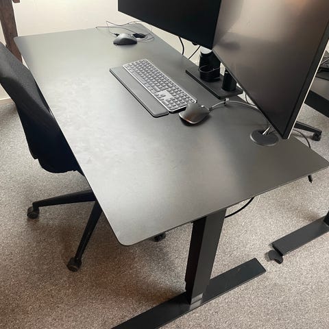 Flotte L-Note El-bord fra Rumas med skuffe. Overflade linoleum i blå med sort kant og sort stel. Sælges med ophæng til skærm. Mulighed for tilkøb af bagskærm.