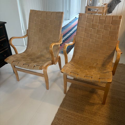 To Bruno Mathsson lænestole med armlæn i lyst træ med flettet sæde og ryg i lys naturfarvede intakte bånd. Stolene har svungne armlæn og ben i formspændt træ og god siddekomfort. Stolene er 50 år gamle; gjorde skiftet hos N. C. Christoffersen, Østerbro for 20 år siden. Revne ved et armlæn må limes. Stolene sælges samlet for 5500 kr.