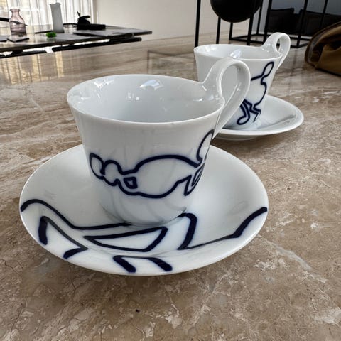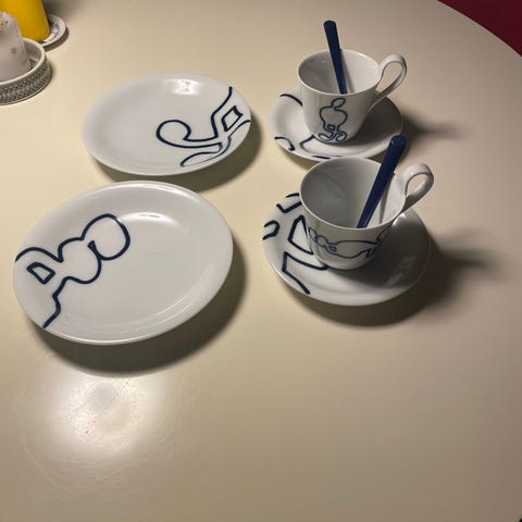 De blå, organiske stregtegninger på det hvide porcelæn er for længst udgået af produktion og er i dag eftertragtede samlerobjekter. Her er muligheden for at få et komplet kaffe/morgenmadssæt til to personer i perfekt stand.