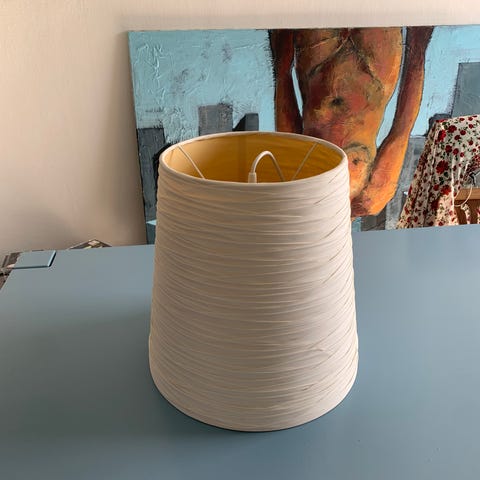 Loftlampe i hvid farve. Lampen har en struktureret, rustik overflade og er formet som en kegleformet skærm med huller i den øverste del til lysgennemgang og ventilation. Velegnet som belysning over bord eller i rum, hvor der ønskes nedadrettet lys. Materiale og mærke er ikke angivet.