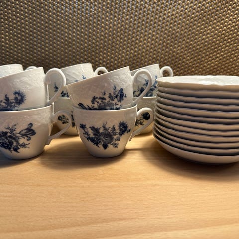 Schumann Arzberg Tradition kaffestel i porcelæn med blå blomstermotiv. Stellet består af tallerkener med gennembrudt kant og blå dekoration samt kopper med matchende blomstermønster. Porcelænet har hvid bundfarve med blå nuancer og naturtro blomsterdekorationer i forskellige varianter. Velegnet som kaffestel eller dessertsæt i hjemmet eller til særlige lejligheder.