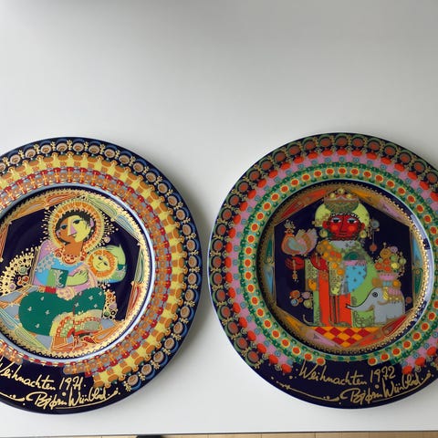 Bjørn Wienblad platte med farverigt, ornamenteret motiv. Rundt fad velegnet som pyntegenstand i hjemmet, f.eks. på væg eller bord. Fadet har et detaljeret mønster med figurativt motiv i midten og flere dekorative borter langs kanten. Sender.