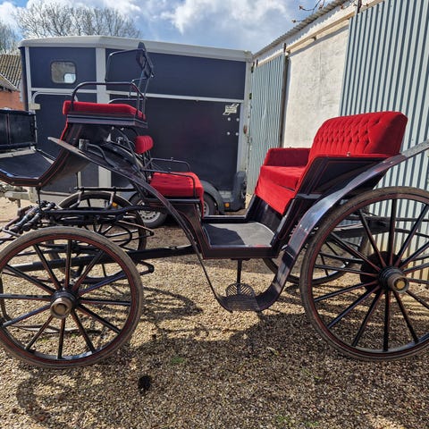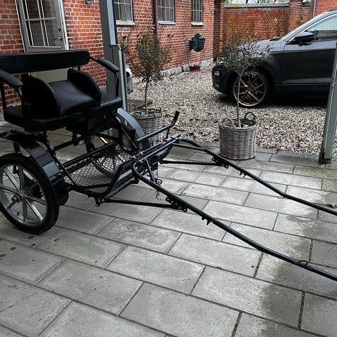 Firehjulet hestevogn i brun metal- og træ-konstruktion med sorte sæder. Vognen har store egerhjul bagtil og mindre forhjul, trinbræt bagpå samt ryglæn og siddepladser til flere personer. Egnet til kørsel med hest, fx fritidskørsel eller træning.