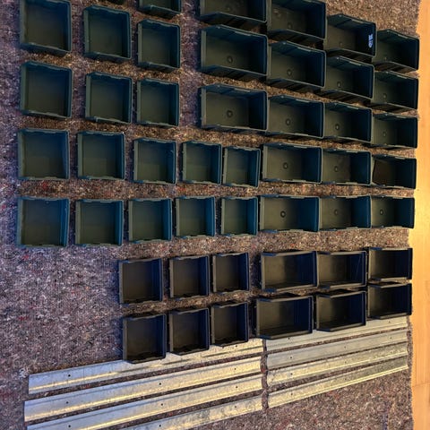 Kasser skal rengøres, bolte er nye. Der er 57 store og 10 små kasser. Ønskes solgt samlet, og afhentet.