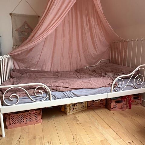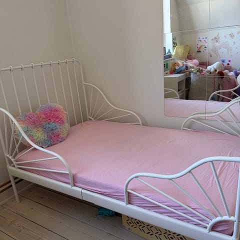 Ikea Minnen lyserød udtræksseng med luröy lamelbund, Innerlig madras (til alle længder) og lagen.