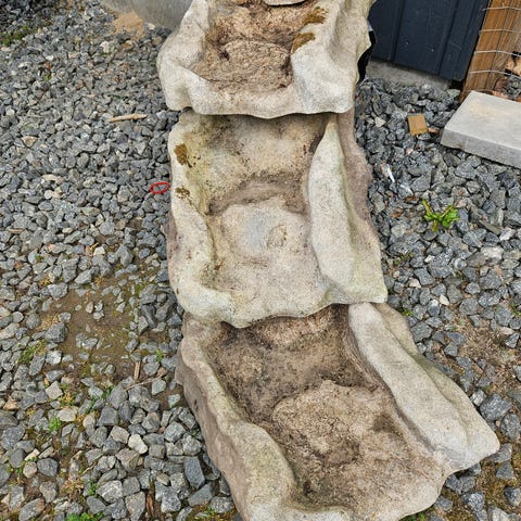 Dekorativ vandsten til haven med flere krukkeformede skåle monteret på en træstolpe. Vandstenen har indbygget pumpe med tilhørende slange og ledning, som fører vandet fra bunden og op gennem stolpen, så det kan løbe ned gennem de forskellige krukker. Velegnet som havedekoration på terrasse, altan eller i bed, hvor der ønskes et mindre vandmiljø med rislende vand. Materialet fremstår som kunststen/keramik kombineret med træstolpe og rebdetaljer.
