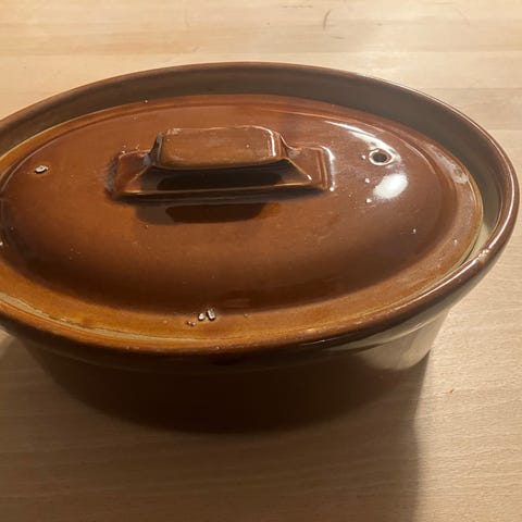 Skålen har en klassisk lys beige nuance med et flot kontrasterende rødbrunt låg. Låget har en dekorativ perlekant og en karakteristisk glasur med små "nålehovedstiks-huller". Disse små huller er medfødte fra produktionen og er en del af keramikandens unikke, rustikke udtryk.