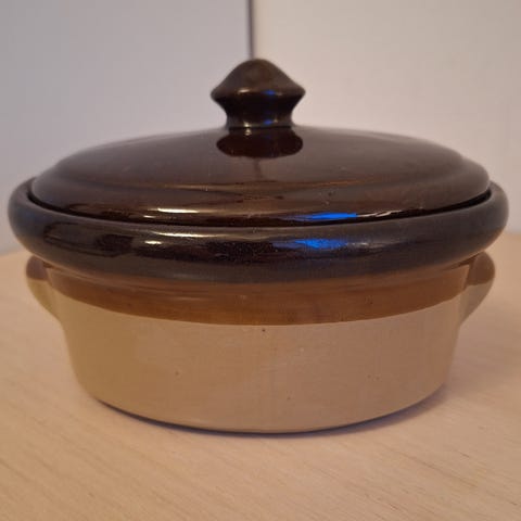 Smuk og autentisk stentøjsskål med tilhørende låg fra den anerkendte engelske producent Price Powell. Skålen er stemplet i bunden med "Genuine British Stoneware - Made in England - 1977", hvilket dokumenterer dens historie på næsten 50 år.