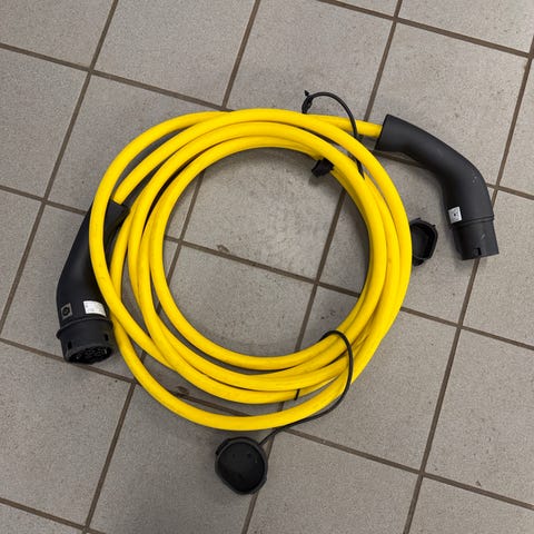 Aptiv ladekabel til elbil i sort. Kablet har stik i begge ender og er beregnet til opladning af elbil. Der er mærkater på håndtagene med produkt- og serienumre samt producentoplysninger fra Aptiv. Velegnet som ladekabel mellem bil og ladestation, hvor der kræves et kabel med denne stiktype og specifikationer som angivet på mærkaterne.