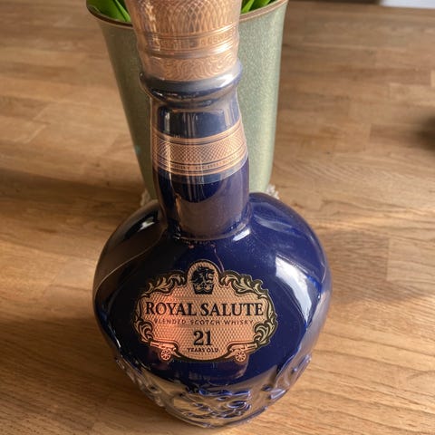 Crown Royal whisky flaske med original æske og blå stofpose. Klassisk Crown Royal blandet canadisk whisky i dekorativ glasflaske med mønstret overflade og skruelåg. Leveres i blå papæske med tryk samt matchende blå stofpose med logo. Velegnet som samlerobjekt eller til baren. Størrelse og alkoholprocent fremgår af etiketten på flasken.