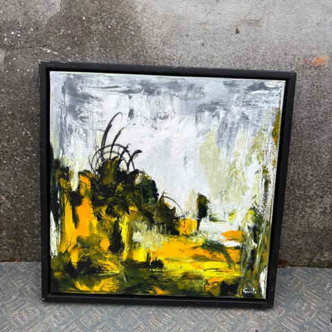 Agnete Hornbeck maleri med abstrakt motiv i overvejende gule og brune nuancer. Billedet er rektangulært og indrammet i en lys ramme. Motivet består af geometriske og organiske former i lagdelte felter, der giver et dynamisk udtryk. Velegnet som vægdekoration i stue, kontor eller andre opholdsrum, hvor der ønskes et større, farverigt kunstværk.
