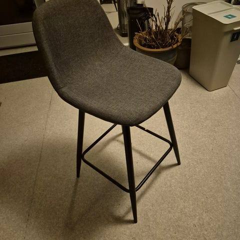 4 grå spisebordsstole, mener de er fra jysk. De har nogle steder hvor de er gået lidt i stykker grundet kattekløer, ellers er de pæne.