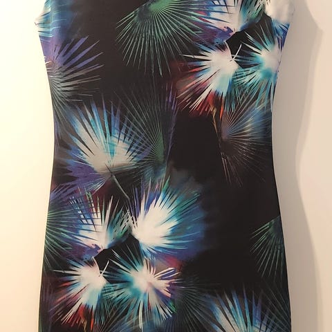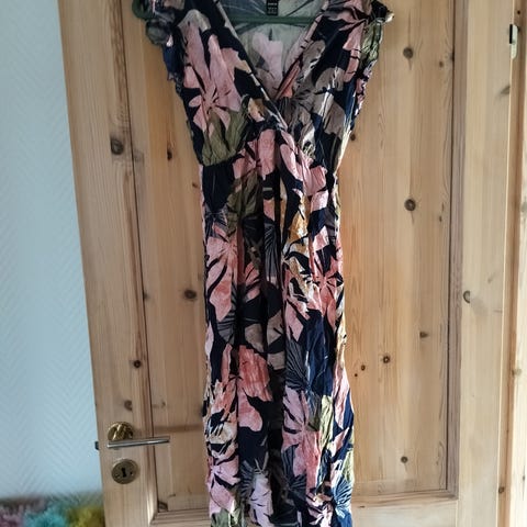 Den er i forskellige nuancer af sort/hvis/pink, med et frisk blomstermønster ned foran.