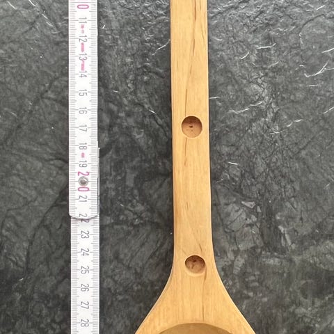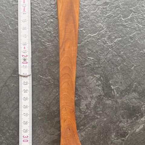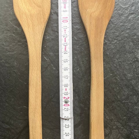 Træ køkkenredskaber i form af to ske-/spatel-lignende redskaber. Længden er ca. 30 cm. Velegnet til madlavning og omrøring i gryder og pander.