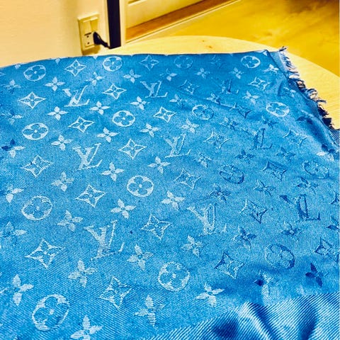 Tørklædet har vævet mønster med Louis Vuitton-monogram og frynser i enderne.