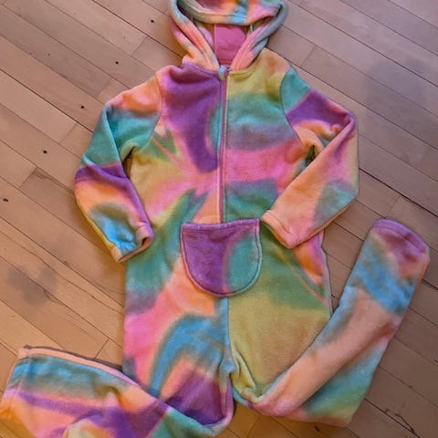 Hyggelig og blød enhjørning heldragt. Skilt med størrelse klippet af, vil tro den passer str. 8-9 år. Trænger til en tur i vaskemaskinen, ellers fin.
